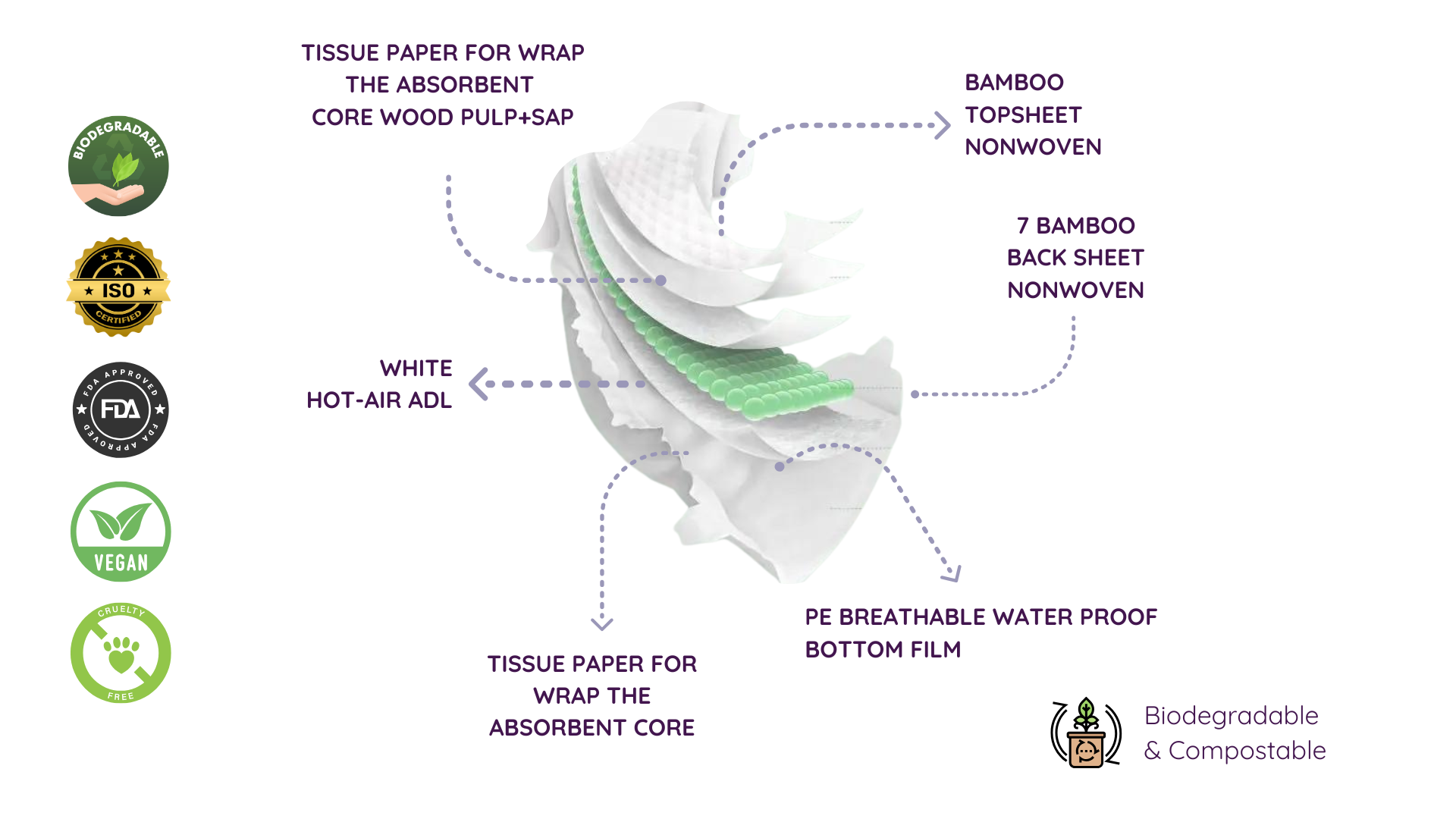 - Rash-Free, Hypoallergenic, Fragrance-free, Wetness indicator, Adjustable, Leakproof, Eco friendly, and 100% Biodegradable